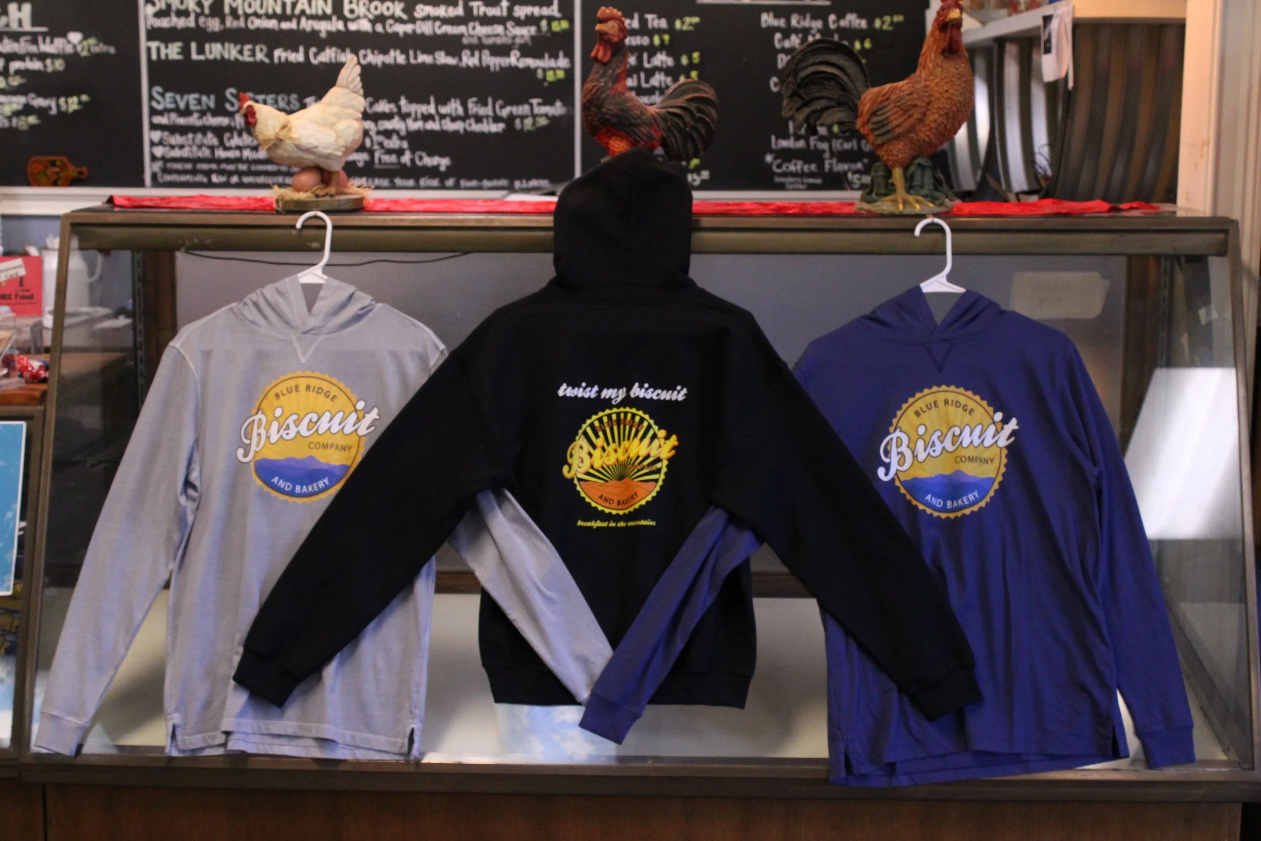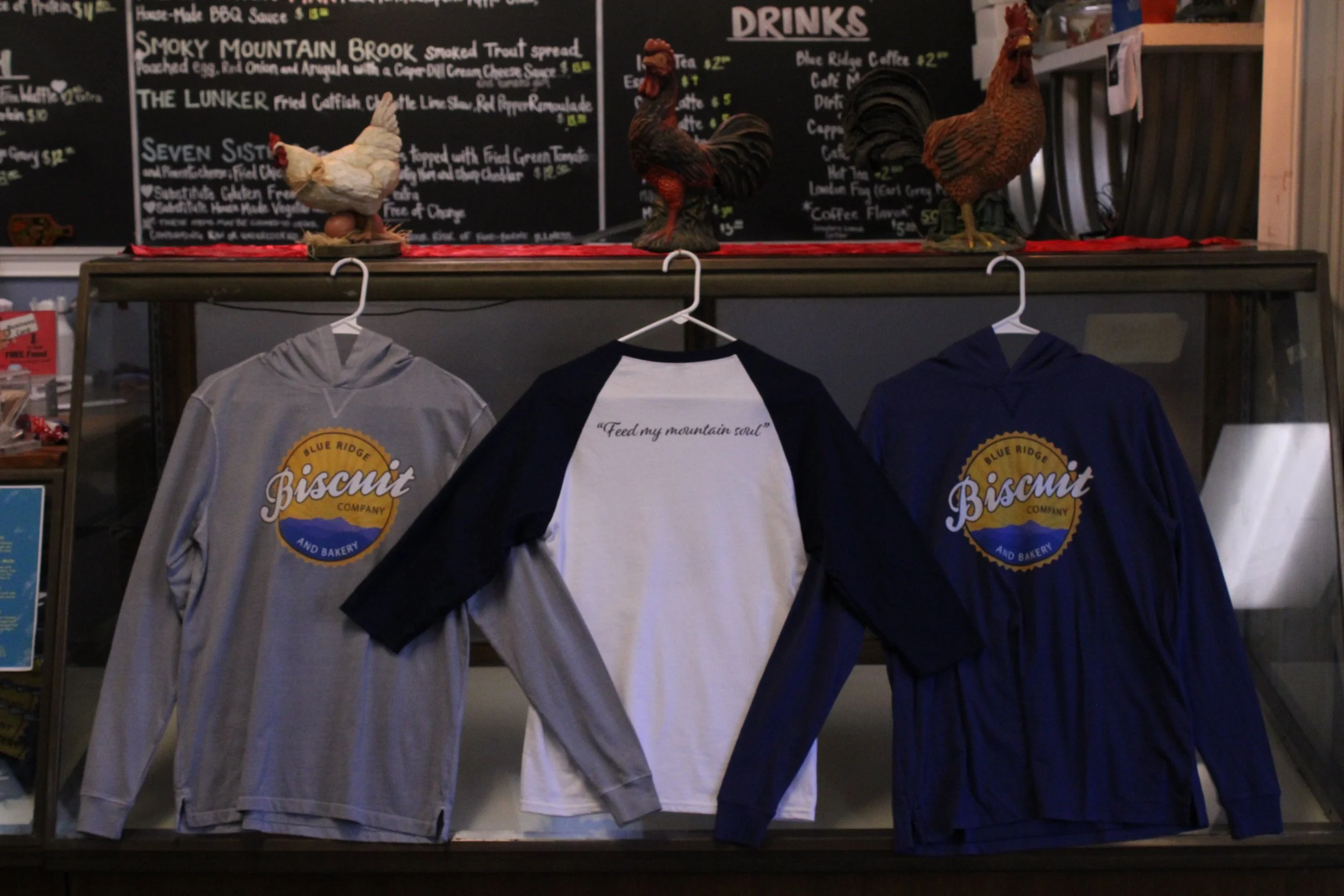 Categories: Select a Category Merchandise Fine Fixin's From our Friends Merchandise | Fine Fixin's | From our Friends | Blue Ridge Biscuit Company Fall 2025 Baseball Shirt $40.00 Blue Ridge Biscuit Company Hoodie $50.00 Blue Ridge Biscuit Company Fall 2025 T-Shirts $30.00 Darjeeling Dreaming Candles $48.00 Sourwood Honey from $10.00 Blue Ridge Biscuit Company Coffee Mug $15.00 Wildflower Honey from $10.00 Free Range Henny's from $10.00 Blue Ridge Biscuit Company "Breakfast in the Mountains" blend coffee $15.00 Blue Ridge Biscuit Company Biscuit Blend Coffee $15.00 Blue Ridge Biscuit Company Previous Run T-Shirt Sale Price: $20.00 Original Price: $30.00 Sale